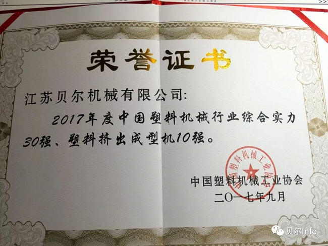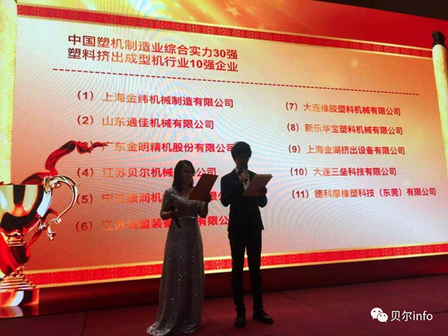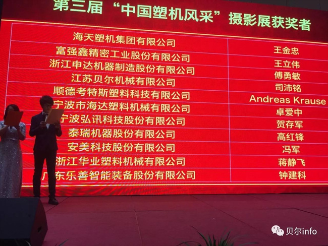 第三屆中國(重慶)國際塑料工業(yè)展覽會在重慶國際博覽中心盛大舉行。重慶市商務(wù)委員會副主任熊林、重慶市經(jīng)濟(jì)和信息化委員會總工程師趙剛、中國塑料機(jī)械工業(yè)協(xié)會會長張劍鳴、中國塑料加工工業(yè)協(xié)會常務(wù)副理事長兼秘書長朱文瑋、重慶市梁平區(qū)區(qū)委常委、梁平工業(yè)園區(qū)管委會主任付云等出席了開幕式。作為中國中西部專業(yè)、大規(guī)模的塑料工業(yè)類展覽會,塑料展已連續(xù)在渝成功舉辦三屆。本屆塑料展主要包括了塑料加工機(jī)械展區(qū)、輔助設(shè)備展區(qū)、智能自動化展區(qū)、模具及零部件展區(qū)、化工及原材料展區(qū)以及塑料制品展區(qū)等六大專業(yè)展區(qū)。此次江蘇貝爾機(jī)械攜產(chǎn)品和研發(fā)成果參展,我們的展位號是:3B63、3B64、3B65。歡迎各界朋友蒞臨江展位洽談,交流。此次展會期間,還同期舉辦了多場論壇會議。第五屆中國國際塑料機(jī)械產(chǎn)業(yè)論壇在此召開舉行。"中國國際塑料機(jī)械產(chǎn)業(yè)論壇"由中國塑料機(jī)械工業(yè)協(xié)會主辦,旨在聚焦國內(nèi)外塑料機(jī)械產(chǎn)業(yè)發(fā)展的現(xiàn)狀與趨勢。該論壇自2011年舉辦以來,得到了國家工信部、發(fā)改委、科技部、中國機(jī)械工業(yè)聯(lián)合會的高度重視、海內(nèi)外塑料行業(yè)協(xié)會/基金會的大力支持以及業(yè)內(nèi)數(shù)百家企業(yè)的廣泛參與。江蘇貝爾機(jī)械作為中國塑料機(jī)械工業(yè)協(xié)會副會長單位受邀參加此次論壇。論壇中,江蘇貝爾機(jī)械榮獲"2017年度中國塑料機(jī)械行業(yè)綜合實(shí)力30強(qiáng)、塑料擠出成型機(jī)10強(qiáng)"稱號。同期舉辦的第三屆"中國塑機(jī)風(fēng)采"攝影展。江蘇貝爾機(jī)械市場信息中心總監(jiān)司沛銘,其優(yōu)秀的攝影作品,榮獲大賽"一等獎(jiǎng)"、"三等獎(jiǎng)"等多項(xiàng)大獎(jiǎng)。