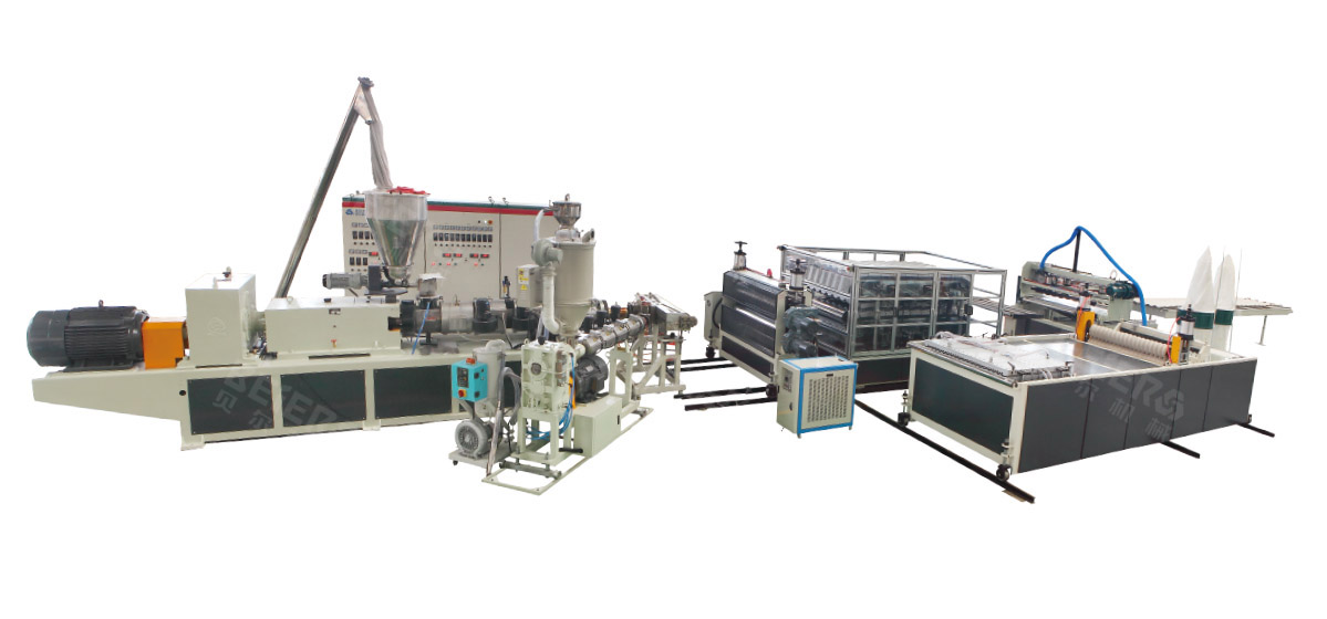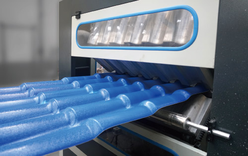 • 生產(chǎn)線主要用于PVC+ASA/PMMA琉璃瓦的生產(chǎn),規(guī)格有寬度720mm、930mm、1100mm,厚度2、2.5、3mm。